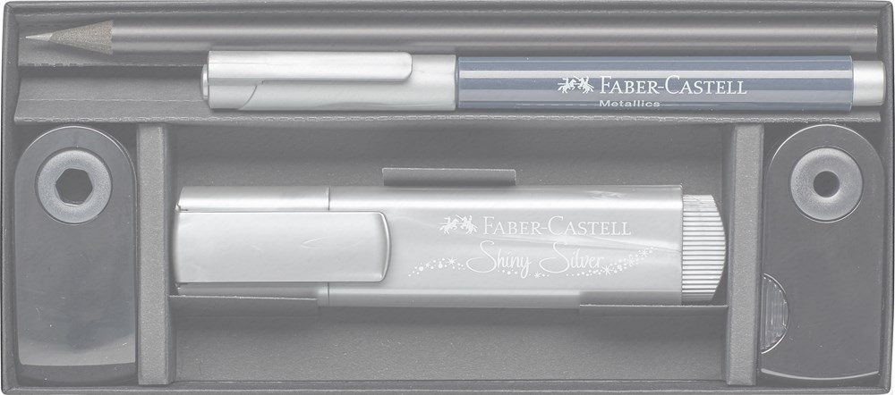 Das Creative Set mit dem Metallics Marker ist ideal zum Verzieren und Gestalten von fast allen Oberflaechen mit einem glaenzenden Metallic-Effekt. Mit dem Metallic Textmarker koennen nicht nur Texte gestaltet werden, er ist auch als Kreativmarker vielseitig einsetzbar und sorgt fuer tolle schimmernde Effekte. Mit dem Designbleistift werden die Linien und Formen vorgezeichnet und er kann zum schraffi eren verwendet werden. Der Radierer (PVC-frei) und die Spitzdose Sleeve Mini komplettieren das Set. Eingelegt in einer Geschenkverpackung mit transluzentem Schuber. Ausführung in Gold.