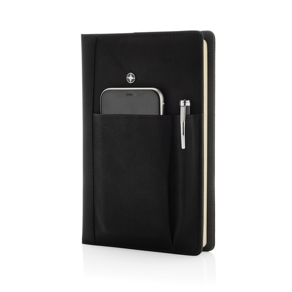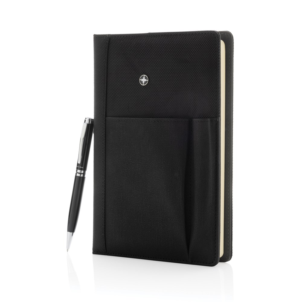 Executive 1680D und 600D Polyester Cover mit herausnehmbaren 192-seitigen Notizbuch und Stift - ca.1200m blauschreibend. Die aufgesetzte Tasche auf der Vorderseite fasst den Stift sowie Ihr Smartphone, Visitenkarten oder Kreditkarten. Verpackt in Swiss Peak Geschenkverpackung.