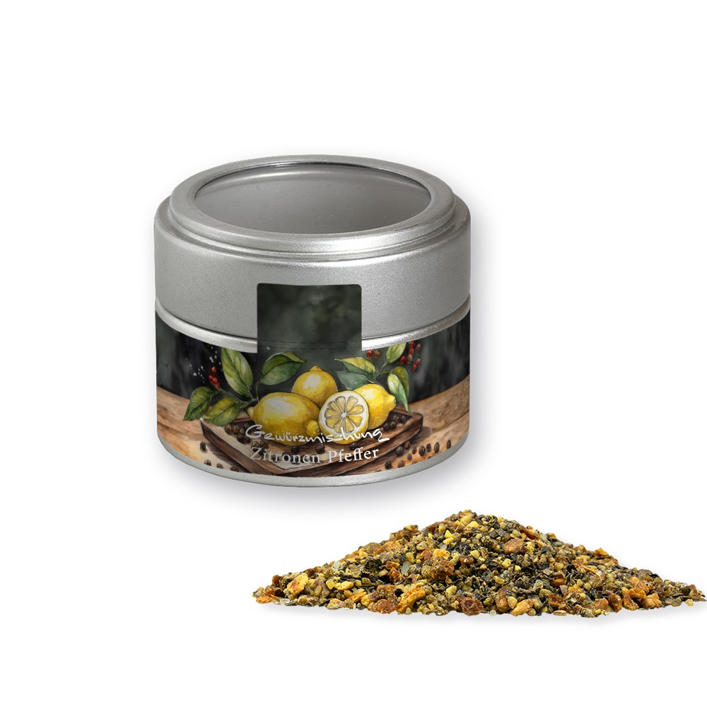 Gewürzmischung Zitronen-Pfeffer, ca. 60g, Metalldose Mini mit Sichtfenster silber