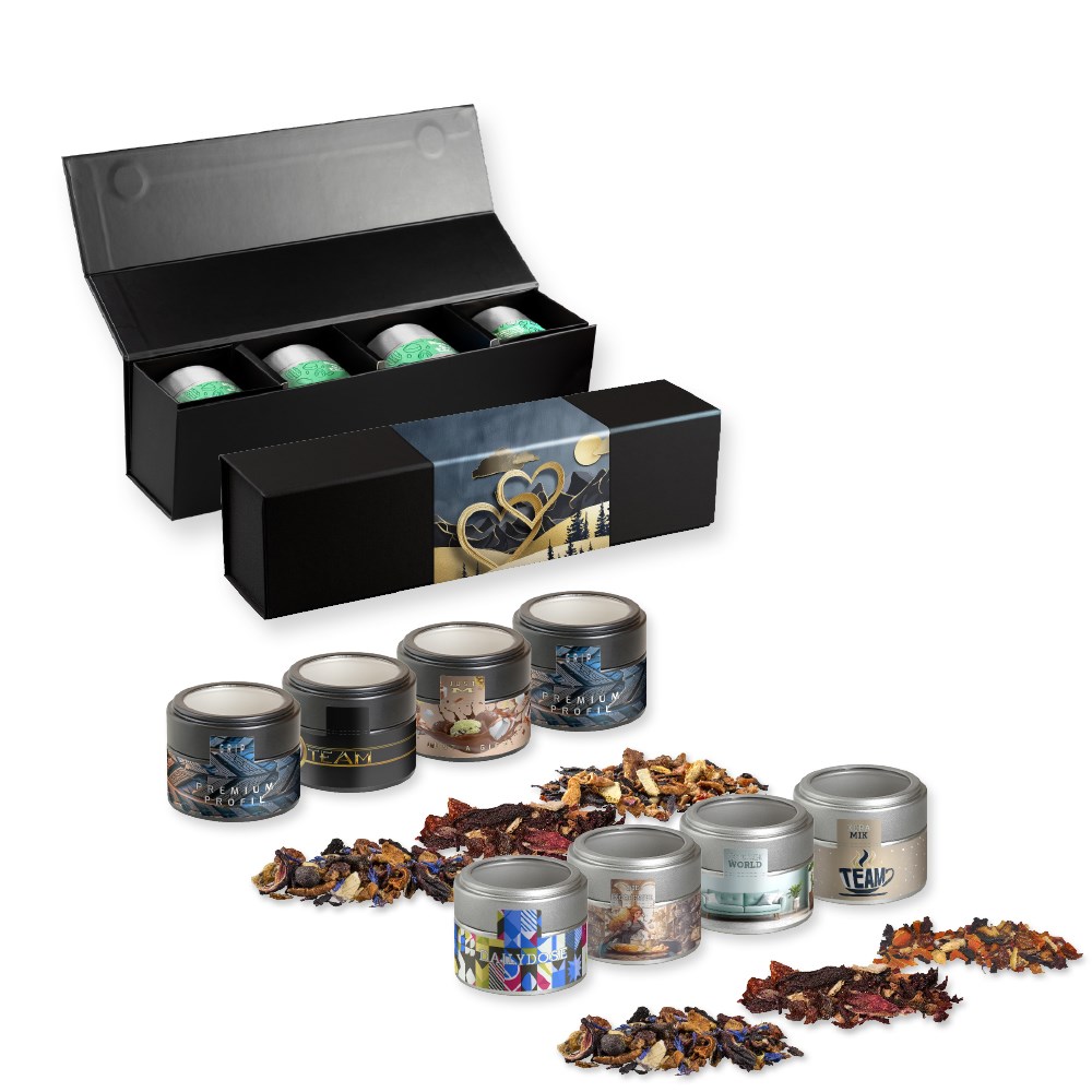 Geschenk-Set Premium schwarz mit Magnetverschluss und 4 Metalldosen Mini mit Sichtfenster aus Papier. Werbeanbringung als Direktdruck in 4c individuell bedruckbar.