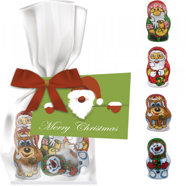 Schoko-Weihnachts Mix, ca. 35g, Express Flachbeutel mit Schleife mit Werbekarte