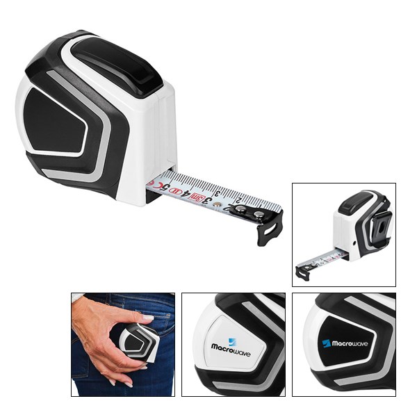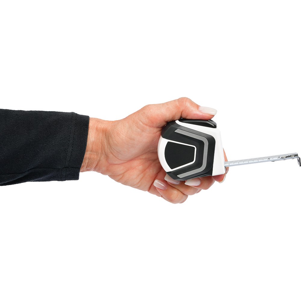 3-Meter-Bandmaß mit autmatischem Bandfeststellmechnismus. Durch den komfortablen automatischen Bandfeststellmechanismus bleibt das Band in der gewünschten Länge fixiert und wird durch Drücken des Knopfes durch den dynamischen Bandrücklauf wieder eingeholt. Der bewegliche Bandanfangshaken ermöglicht exaktes Messen auf Stoß und Zug. Gehäuse: schlagfestes 2-Komponenten-Gehäuse aus ABS und TPR. Stahlband: 3 m/19 mm, lackiert. Knickfestigkeit: 1,80 m. Skalierung: cm, einseitig. Genauigkeitsklasse: EG-Klasse II. Ausstattung: automatischer Bandfeststellmechanismus, dynamischer Bandrücklauf, beweglicher Bandanfangshaken, Gürtelclip. Verpackung: schwarze Geschenkverpackung.