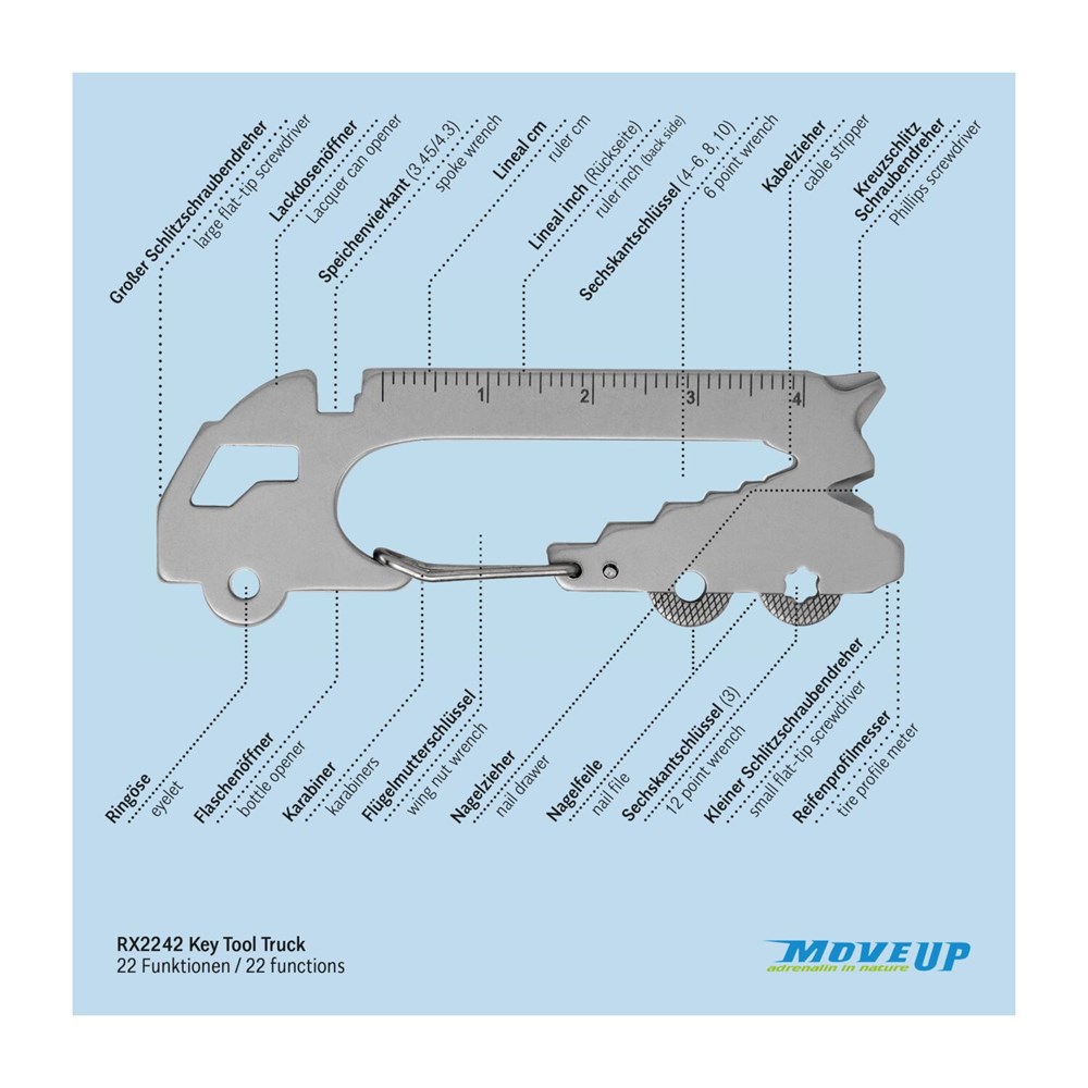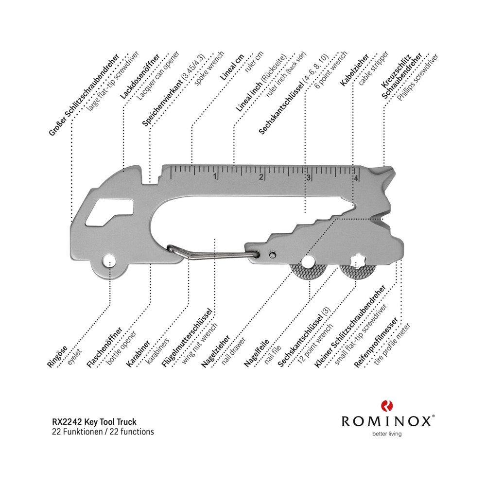 Überraschen Sie Ihre Handwerker mit Multifunktionstools als Schlüsselanhänger: ein ideales Geschenk nicht nur zum Geburtstag oder zu Weihnachten und nicht nur für Männer. Mit den kleinen Begleitern von ROMINOX® haben Sie die praktischsten Werkzeuge wie Schraubenzieher, Lineal oder Sechskantschlüssel immer dabei, egal ob im Alltag, im Büro oder auf Reisen. Das Key Tool Truck / LKW mit 22 Funktionen kommt in einem „Große Helden (Einzelhandel)”-Mäppchen inkl. Funktionsbeschreibung. „An die Werkzeuge, fertig, los“! Finden Sie die perfekte Kombination aus Ihrem Lieblings Keytool und Motiv-Mäppchen. Auf Wunsch auch mit Gravur und/oder im Mäppchen im Eigendesign erhältlich.