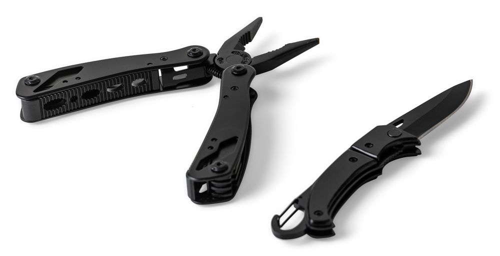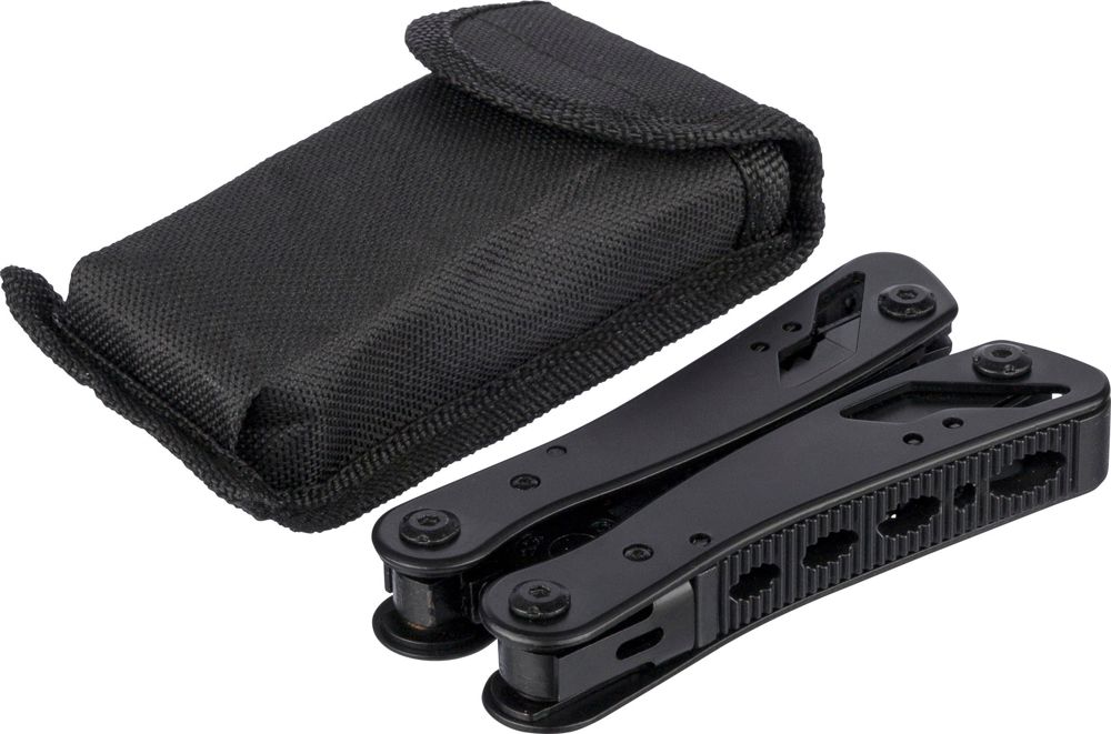 Multifunktionswerkzeug aus schwarzem Aluminium und Edelstahl verfügt über 13 Funktionen, darunter Messer, Schraubendreher, Zange, Säge, Feile, Hebel, Bits, Feder, Schlaufenstange, Dosenöffner und Angel. Es wird mit einer Tasche mit Klettverschluss-Gürtelschlaufe und einer zusätzlichen Außenverpackung geliefert. Es ist einzeln in einem braunen Karton verpackt.