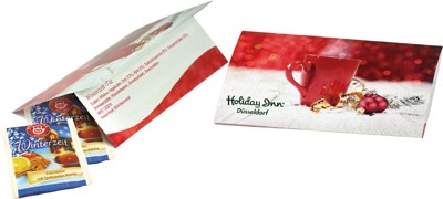 Dieses Klappkärtchen enthält 2 Teebeutel mit Winter-Tee für den besonderen Genuss in der kühlen Jahreszeit. Einfach mal inne halten und sich eine kleine "Tee-Pause" gönnen. Platz für den Werbedruck ist auf dem Standardmotiv des Kärtchens oder eine eigene Gestaltung des Kärtchens, jeweils bereits ab 250 Stück.