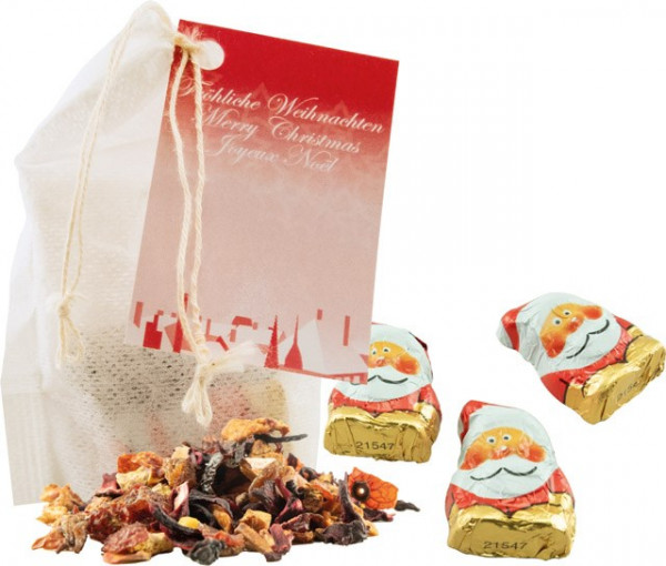 Inhalt: ca. 3 g Weihnachts-Früchtetee, 3 Schoko-Weihnachtsmännchen (je 5 g)