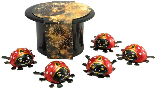 5 kleine Schokokäfer versüßen den Jahresausklang und verheißen viel Glück für das neue Jahr. Die Banderole kann im Standardmotiv mit Ihrem Werbeeindruck versehen oder, auch ab 250 Stück, individuell gestaltet werden.