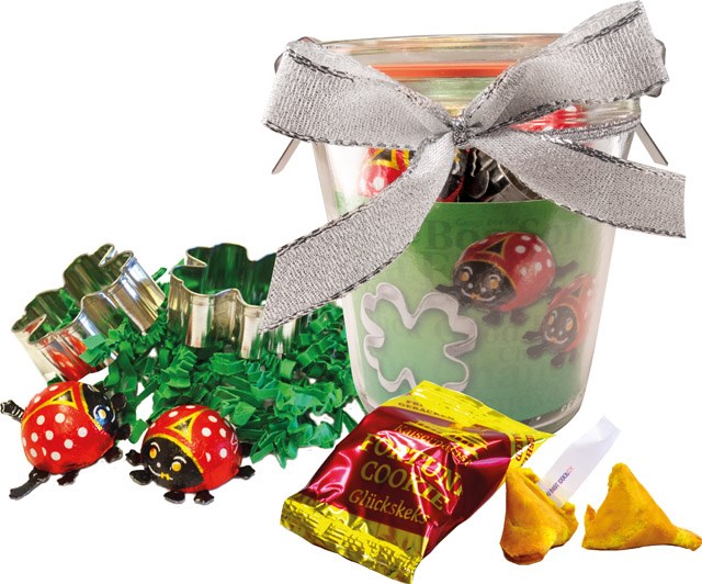 Das Glücksglas garantiert einen sympathischen Jahresabschluss und einen gelungenen Start in das Neue Jahr. Das Weckglas enthält einen Glückskeks, 2 Ausstechformen Kleeblatt und 2 Glückskäfer aus Schokolade. Platz für den Werbedruck ist auf dem Standardmotiv des Einlegers oder eine eigene Gestaltung, jeweils ab 100 Stück.