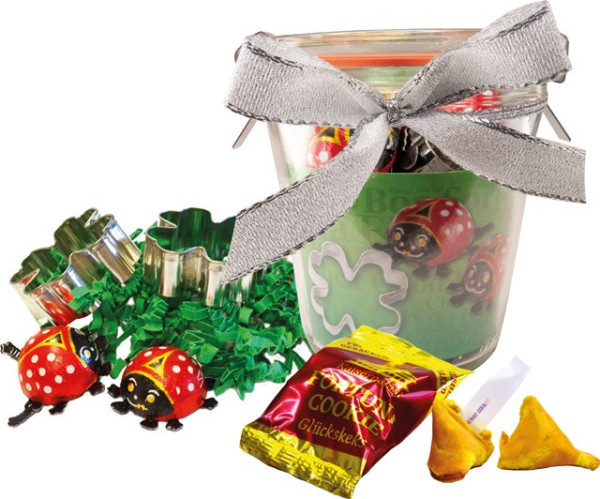 Inhalt: Weckglas (290 ml), 2 Ausstechformen Kleeblatt, je ca. 5 cm, Glückskeks (6 g), 2 Schokokäfer (je 6 g), Rezept auf Innenkarte