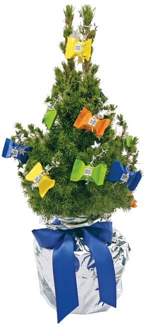 Eine lebende Zuckerhutfichte 35 - 45 cm, verpackt in einer Einzelversandkartonage, als kleiner Baum zu Weihnachten. Klassisch und dekorativ versetzt diese Zuckerhutfichte jeden Raum in eine weihnachtliche Stimmung. Das Bäumchen kann auf Wunsch von uns direkt an einzelne Empfänger versendet werden. Geschmückt ist das Bäumchen mit 24 Stück Ritter Sport Würfeln. Deko für den Topf: Topffolie silber, Schleife rot. Die Farben der Schleifen (rot, orange, blau, gold, silber) und Topffolien (gold, silber, Jute, Naturpapier) sind beliebig kombinierbar. Ein Werbeeindruck kann auf unserem Anhängekärtchen Artikel 6202 (40 x 60 mm) ab 100 Stück erfolgen oder auf einer Beilage nach Wunsch.