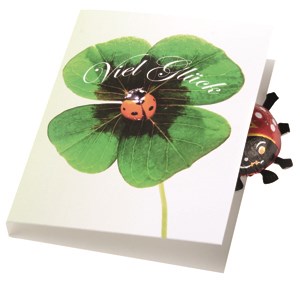 Nicht nur zu Silvester, sondern das ganze Jahr über wird Glück benötigt. Dieses Klappkärtchen enthält einen Glückskäfer (6 g) aus Vollmilch-Schokolade. Platz für den Werbedruck ist auf dem Standardmotiv der Karte oder eine eigene Gestaltung, jeweils ab 250 Stück. Inhalt: Schokokäfer (6 g)