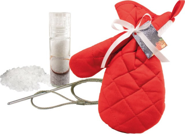 Nachhaltigkeit ist auch beim Grillen möglich. Auf unserem Edelstahl-Grilldraht lässt sich leicht Fleisch oder Gemüse zum Grillen oder für die Pfanne aufspießen. Er ist leicht zu reinigen und kann immer wieder verwendet werden. Komplettiert wird das Grillvergnügen durch die Mühle mit Meersalz, die sich ebenfalls im vielseitig verwendbaren Handschuh befindet. Ab 100 Stück kann die Karte im Standardmotiv mit einem Werbeeindruck oder auch vollständig individuell gestaltet werden. Inhalt: Grilldraht, Gewürzmühle, ca. 30 g Meersalz