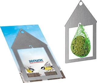 Ein kleines aber feines Vogelhäuschen aus Edelstahl. Dieses neuartige Vogelhäuschen benötigt aufgrund seiner Größe kaum Platz. Direkt vor dem Fenster, auf der Terrasse oder dem Balkon kann man die Vögel gut beobachten. Lieferung ohne Meisenknödel. Der Werbedruck erfolgt auf dem Standardmotiv der Karte oder eine eigene Gestaltung, jeweils ab 250 Stück.