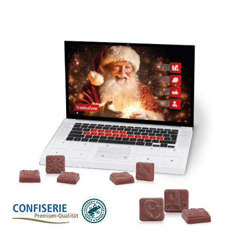 Auffällig, individuell und beliebt! Der auffällige Laptop-Adventskalender ist ein echtes Highlight und das ideale Kundengeschenk zu Weihnachten. Auch bei Mitarbeitern und Mitarbeiterinnen ist der formschöne Kalender heiß begehrt. Leckere Vollmilchschokolade versüßt die Adventszeit 24 Tage lang. Produktdetails: Schokoladen-Adventskalender zum Aufklappen in hochwertiger Vollkartonhülle, (FSC®-zertifiziert). 4-farbig bedruckt, im Querformat. Kalender in Aromaschutzverpackung. Gleich mitbestellen: Stabiler Einzelkarton für den Postversand an Ihre Kunden: 0,59 Euro pro Stück. Nachhaltigkeit: Wir verwenden FSC®-zertifizierten Karton aus nachhaltiger Forstwirtschaft und anderen kontrollierten Quellen. Innen- und Außenteil recycelbar. Für jede Bestellung mit uns wird ein Baum über Grow my Tree gepflanzt.
