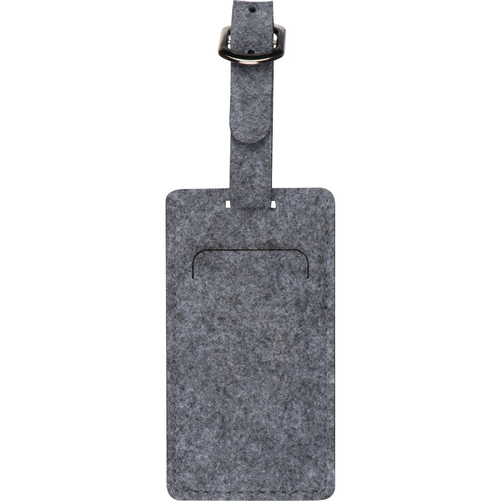 Kofferanhänger aus Filz mit verstellbarer Befestigung und aufklappbarer Abdeckung über dem Adressfeld. Ihre Werbung bringen wir auf einer Seite an.