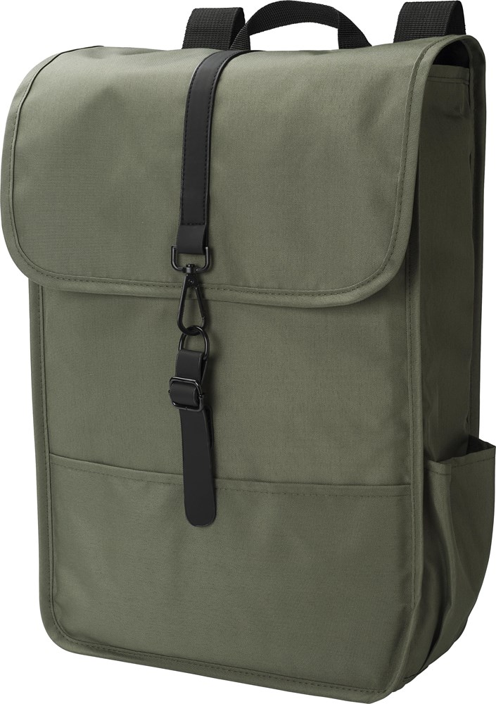 rPET Polyester (300D) Rucksack mit Lasche. Zwei Flaschentaschen an der Seite. Ein großes Fach. Mit schwarzem PU-Gurt mit Verschlussschnalle.