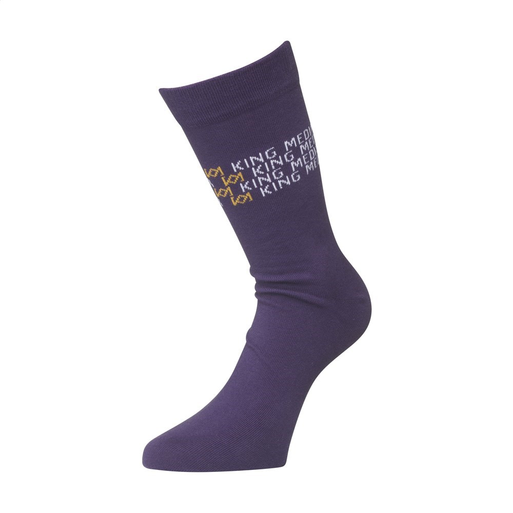 Socken gestrickt aus Baumwolle (80%), Polyamid (15%) und Lycra (5%). Inklusive gestricktem, individuellem Design. Wählen Sie ein subtiles Muster oder ein bestimmtes Design auf der gesamten Socke. Die Socken können in bis zu 7 verschiedenen Farben gestrickt werden. Wählen Sie aus mehreren Garnfarben. Die Socken sind mit einem Kartonetikett aneinander befestigt. Dies kann auch mit einem eigenen Design in Vollfarbe versehen werden. Auf diese Weise entwerfen Sie Ihre eigenen Socken, die perfekt zu Ihrer Geschäftsidentität und Ihren Wünschen passen. Erhältlich in den Größen XS (35-37), S (38-40), L (41-43) und XL (44-46). Bei max. 30 Grad waschen. Nicht in den Trockner. Nicht bügeln. Mindestbestellmenge: 50 Paar Socken pro Größe.