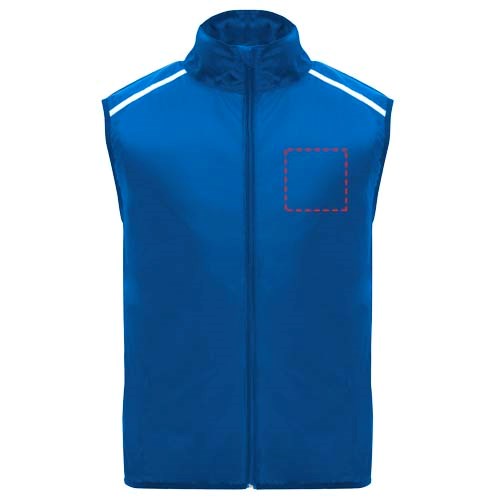 Leichte Funktions - Laufweste, winddicht und atmungsaktiv. Frontreißverschluss mit passendem Kinnschutz. Elastische Einfassung am Armausschnitt und Saum. Untere Rückenpartie aus mikroperforiertem Stoff. Reflektierende Details auf den Schultern, Front- und Rückseite. Tasche mit elastischem Band zum Verstauen der Weste und zum Tragen am Handgelenk. Abnehmbares Etikett.