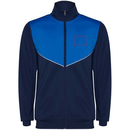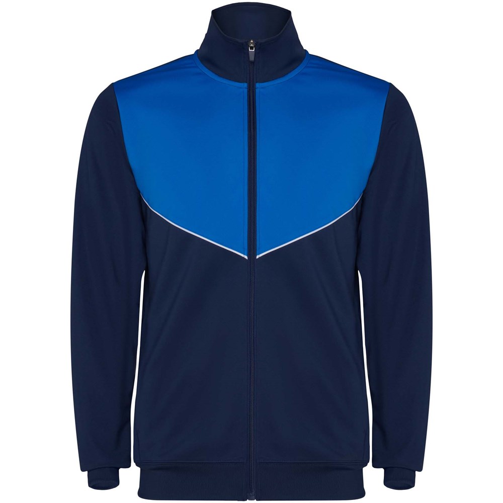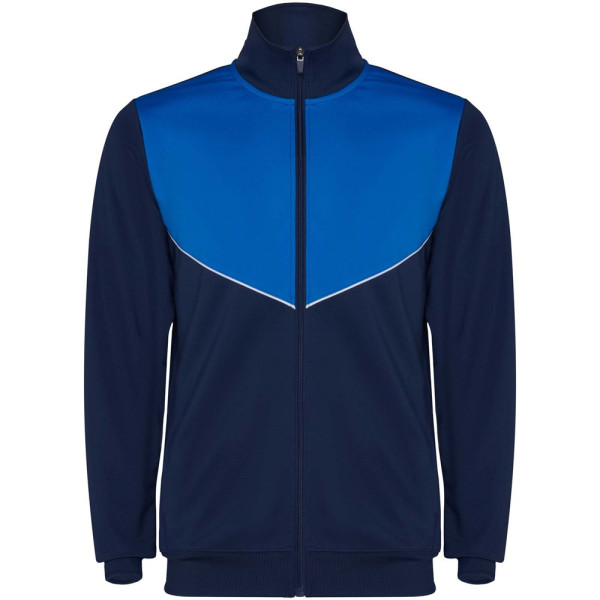 Trainingsanzug aus leichtem und elastischem Stoff. Jacke mit farblich abgesetzten Nähten im Brustbereich. Hoher Kragen mit Kontrastnähten. Zentraler Frontreißverschluss. Seitentaschen. 2x2-Rippenbündchen an Ärmeln und Bund. Hose mit elastischem Bund und Kordelzug. Seitliche Kontrasteinsätze mit Steppnaht. Beinsaum mit Reißverschluss.