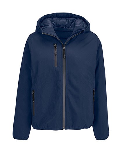 Aus recyceltem Polyester | Dreilagiges Softshell-Gewebe | Wasserdichte und atmungsaktive 5000-mm-Membran | Vollständig wattierte Softshelljacke für den Winter | Kapuze mit elastischem Abschluss | Vorderverschluss, Seiten- und Brusttaschen mit schwarzem, wasserdichtem Nylon-Reißverschluss | Drei Innentaschen | Reißverschluss zur individuellen Anpassung | Elastische Ton-in-Ton-Schrägbandeinfassung an Bündchen und Saum