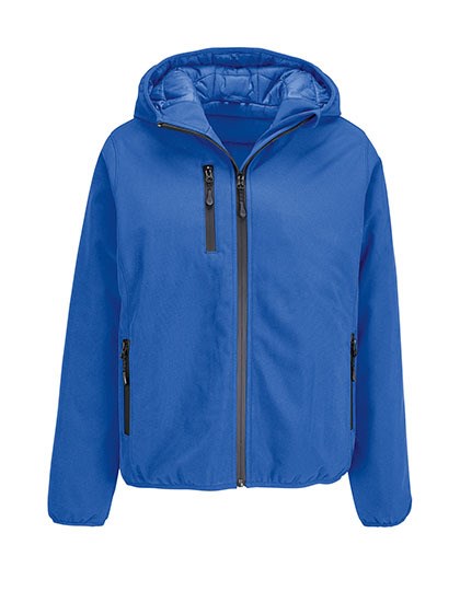 Aus recyceltem Polyester | Dreilagiges Softshell-Gewebe | Wasserdichte und atmungsaktive 5000-mm-Membran | Vollständig wattierte Softshelljacke für den Winter | Kapuze mit elastischem Abschluss | Vorderverschluss, Seiten- und Brusttaschen mit schwarzem, wasserdichtem Nylon-Reißverschluss | Drei Innentaschen | Reißverschluss zur individuellen Anpassung | Elastische Ton-in-Ton-Schrägbandeinfassung an Bündchen und Saum