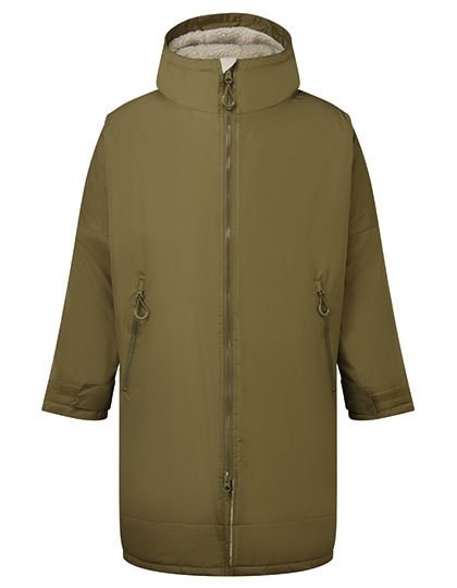 Unisex | Oversized | Durchgehender Zwei-Wege-Reißverschluss aus Kunststoff mit leicht zu bedienenden Schiebern | Kinnschutz | Oversized-Passform | Seitliche Belüftungsöffnungen | Verstellbare Ärmelbündchen mit Klettverschluss | Seitliche Reißverschlusstaschen | Innentasche mit Reißverschluss auf der linken Seite | Aufgesetzte Innentasche auf der rechten Seite | 3-teilige Kapuze | Schlaufe in der Mitte der Rückseite der Jacke zum Aufhängen des Bademantels | Verlängerter Saum hinten | Zugang zum Stickbereich auf der Rückseite, Brustbereich auch hier zugänglich | Wasserdichte, versiegelte Nähte | Innenseite aus Sherpa-Fleece | Transporttasche mit doppeltem Kordelzug