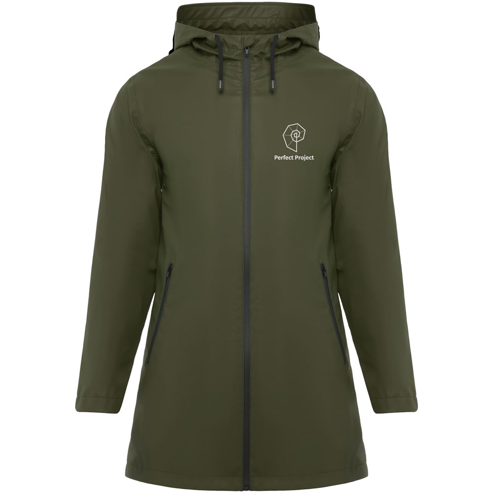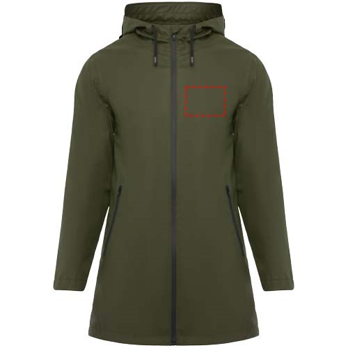Wasserdichter Regenmantel. Kapuze mit Schirm. Hitzeversiegelte Reißverschlüsse und Nähte. Kontrastierende Details in Schwarz. Zwei Seitentaschen mit Reißverschluss. Schlitz am hinteren Saum. Abnehmbares Etikett. Wasserdicht. Das Modell ist 179 cm groß und trägt Größe S.