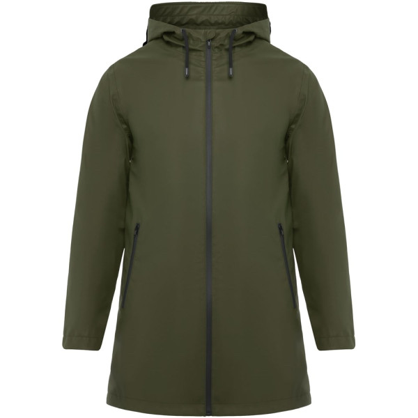 Wasserdichter Regenmantel. Kapuze mit Visier. Hitzeversiegelte Reißverschlüsse und Nähte. Kontrastierende Details in Schwarz. Zwei Seitentaschen mit Reißverschluss. Schlitz am hinteren Saum. Herausnehmbares Etikett. Wasserdicht. Das Modell ist 185 cm groß und trägt Größe M.