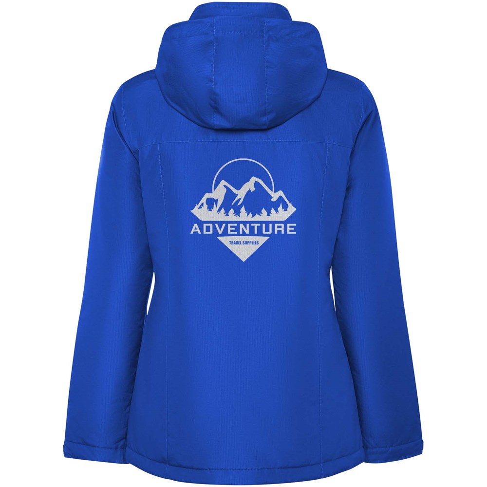 Wasserabweisende, wattierte Parkajacke für Damen. Schlanke Passform. Hoher Kragen mit einrollbarer und abnehmbarer Kapuze mit Klettverschluss. Mittig durchgehender Reißverschluss mit Patte. Seitentaschen mit Reißverschluss und fester Patte. Innentasche mit Klettverschluss. Verstellbare Ärmelbündchen mit Klettverschluss. Verstärkungen im Rücken und auf der linken Brust.