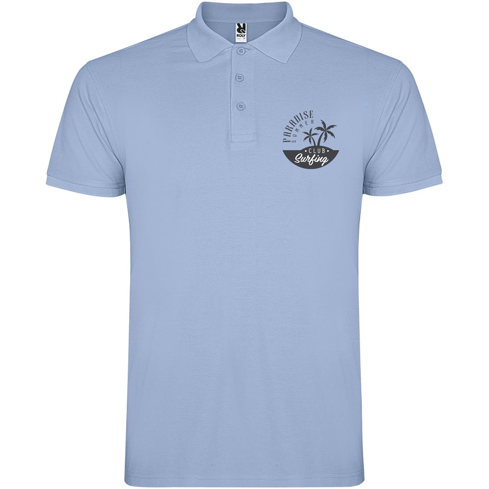 Kurzärmeliges Poloshirt für Herren. Verstärkte und verdeckte Nähte am Innenkragen. 1x1 Rippstrickbündchen an Ärmeln und Kragen. Seitennähte. 3-Knopfleiste und Seitenschlitze. Optionale Tasche. Herausnehmbares Etikett. Das Modell ist 185 cm groß und trägt Größe L.