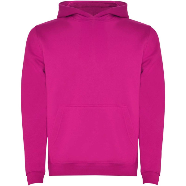 Zweifarbiger Kapuzenpullover mit doppeltem Stoff. Verstärkte und verdeckte Nähte am Kragen und an der Kängurutasche. Elastischer 1×1-Rippstrick an Ärmeln und Bund. Herausnehmbares Etikett. Das Modell ist 120 cm groß und trägt Größe 5/6.
