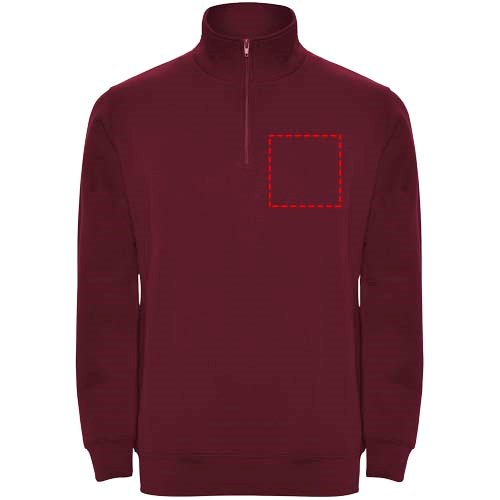 Sweatshirt mit passendem halben Reißverschluss und Polokragen. Passender Innenkragen. Verstärkte, abgedeckte Nähte am Innenkragen. 1×1 Rippbündchen an Ärmeln und Taille. Das Modell ist 185 cm groß und trägt Größe M.