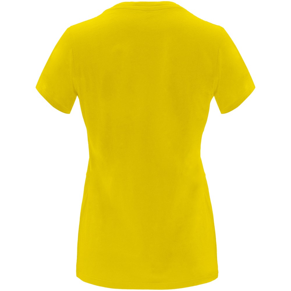Tailliertes kurzärmeliges T-Shirt für Damen. Rundhalsausschnitt mit 1×1 Rippstrick. Verstärkte und verdeckte Nähte am Kragen. Herausnehmbares Etikett.