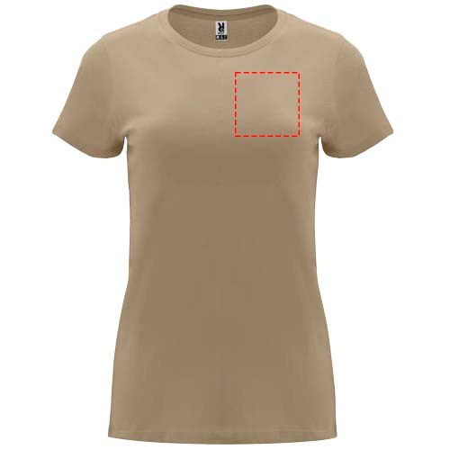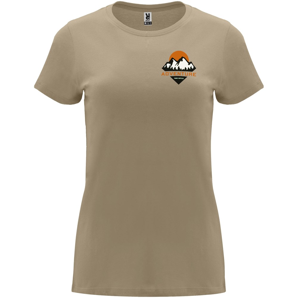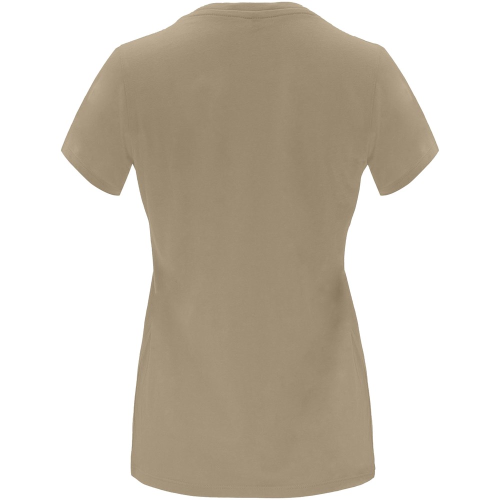 Tailliertes kurzärmeliges T-Shirt für Damen. Rundhalsausschnitt mit 1×1 Rippstrick. Verstärkte und verdeckte Nähte am Kragen. Herausnehmbares Etikett.