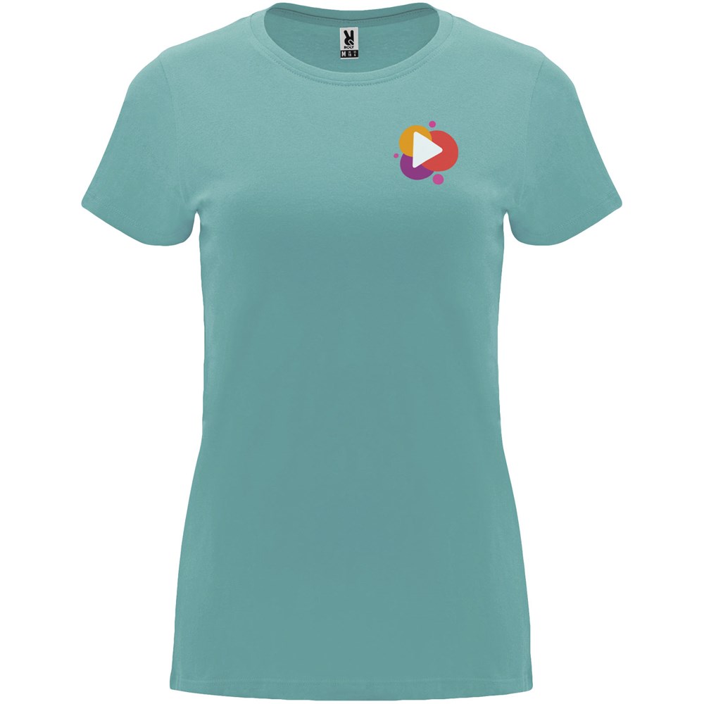 Tailliertes kurzärmeliges T-Shirt für Damen. Rundhalsausschnitt mit 1×1 Rippstrick. Verstärkte und verdeckte Nähte am Kragen. Herausnehmbares Etikett.