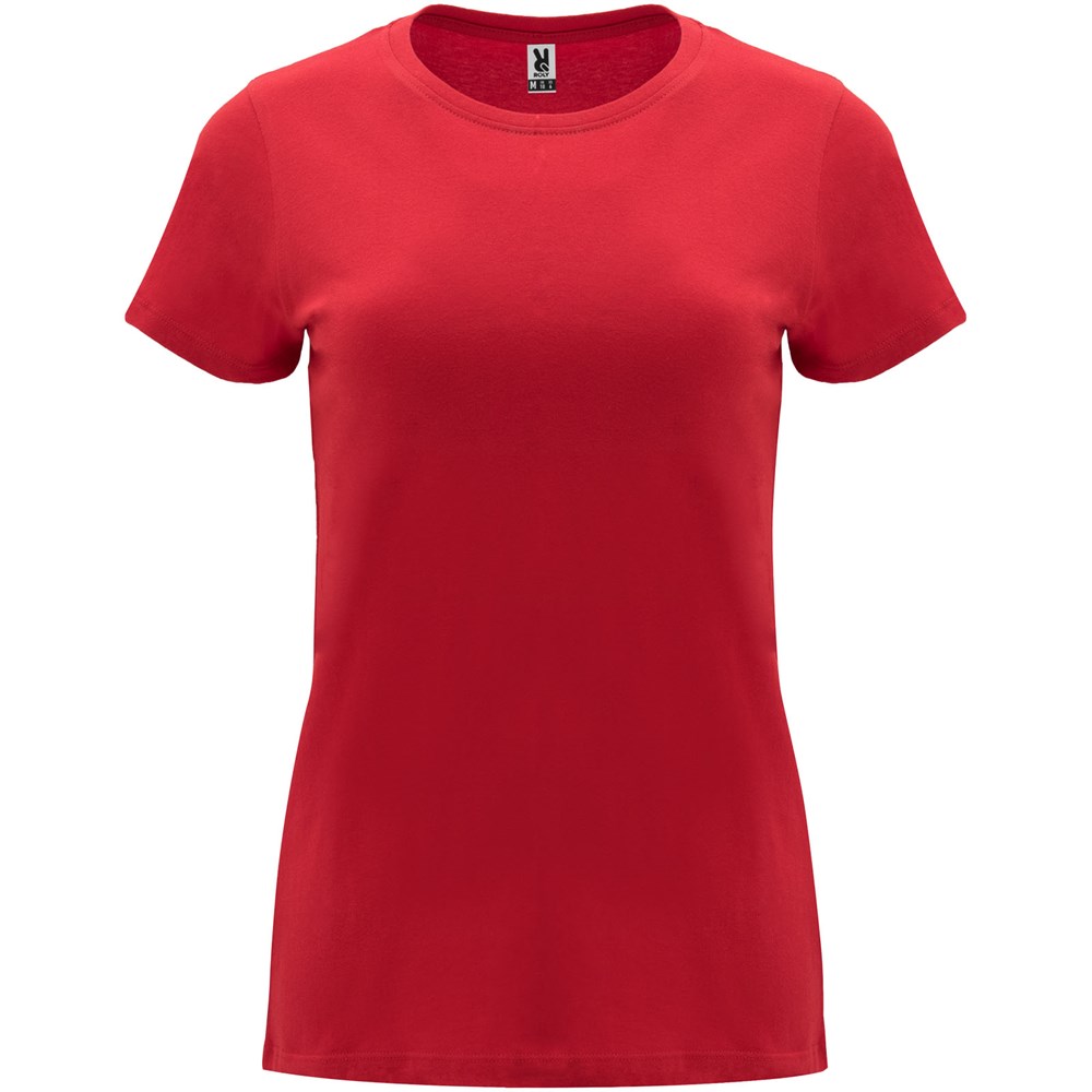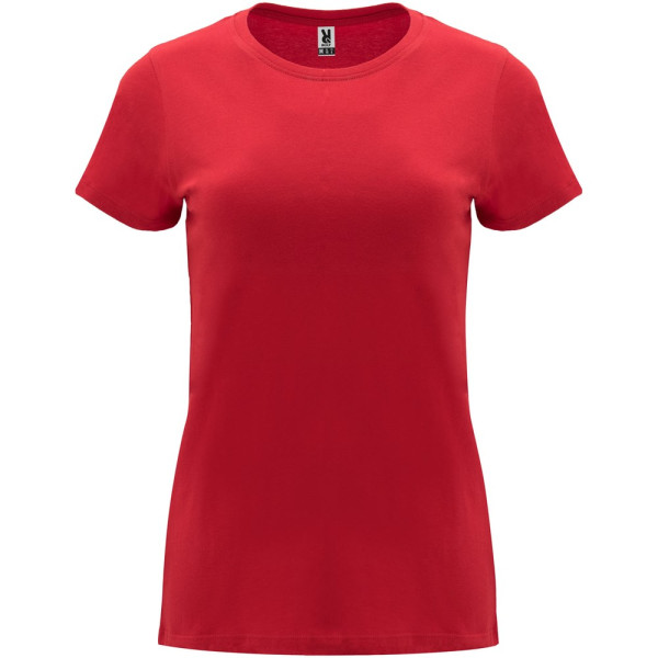 Tailliertes kurzärmeliges T-Shirt für Damen. Rundhalsausschnitt mit 1×1 Rippstrick. Verstärkte und verdeckte Nähte am Kragen. Herausnehmbares Etikett.