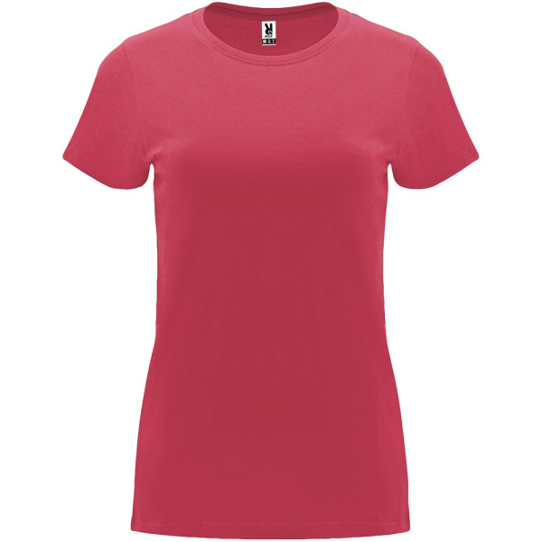 Tailliertes kurzärmeliges T-Shirt für Damen. Rundhalsausschnitt mit 1×1 Rippstrick. Verstärkte und verdeckte Nähte am Kragen. Herausnehmbares Etikett.