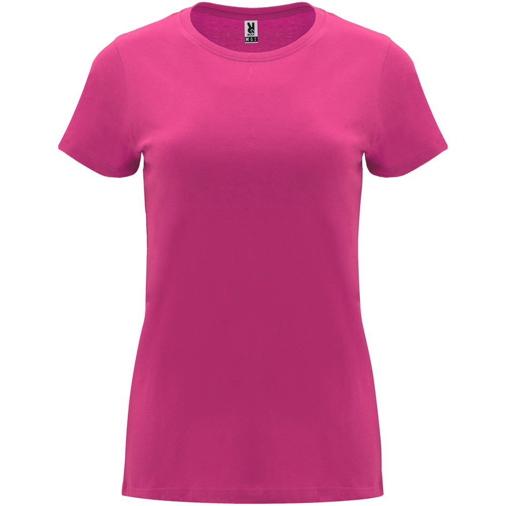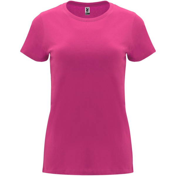 Tailliertes kurzärmeliges T-Shirt für Damen. Rundhalsausschnitt mit 1×1 Rippstrick. Verstärkte und verdeckte Nähte am Kragen. Herausnehmbares Etikett.