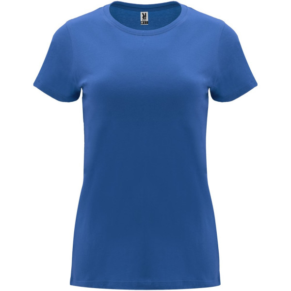 Tailliertes kurzärmeliges T-Shirt für Damen. Rundhalsausschnitt mit 1×1 Rippstrick. Verstärkte und verdeckte Nähte am Kragen. Herausnehmbares Etikett.