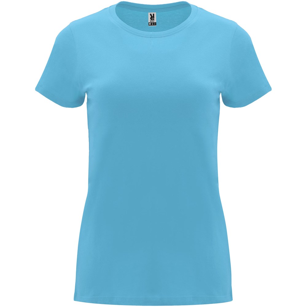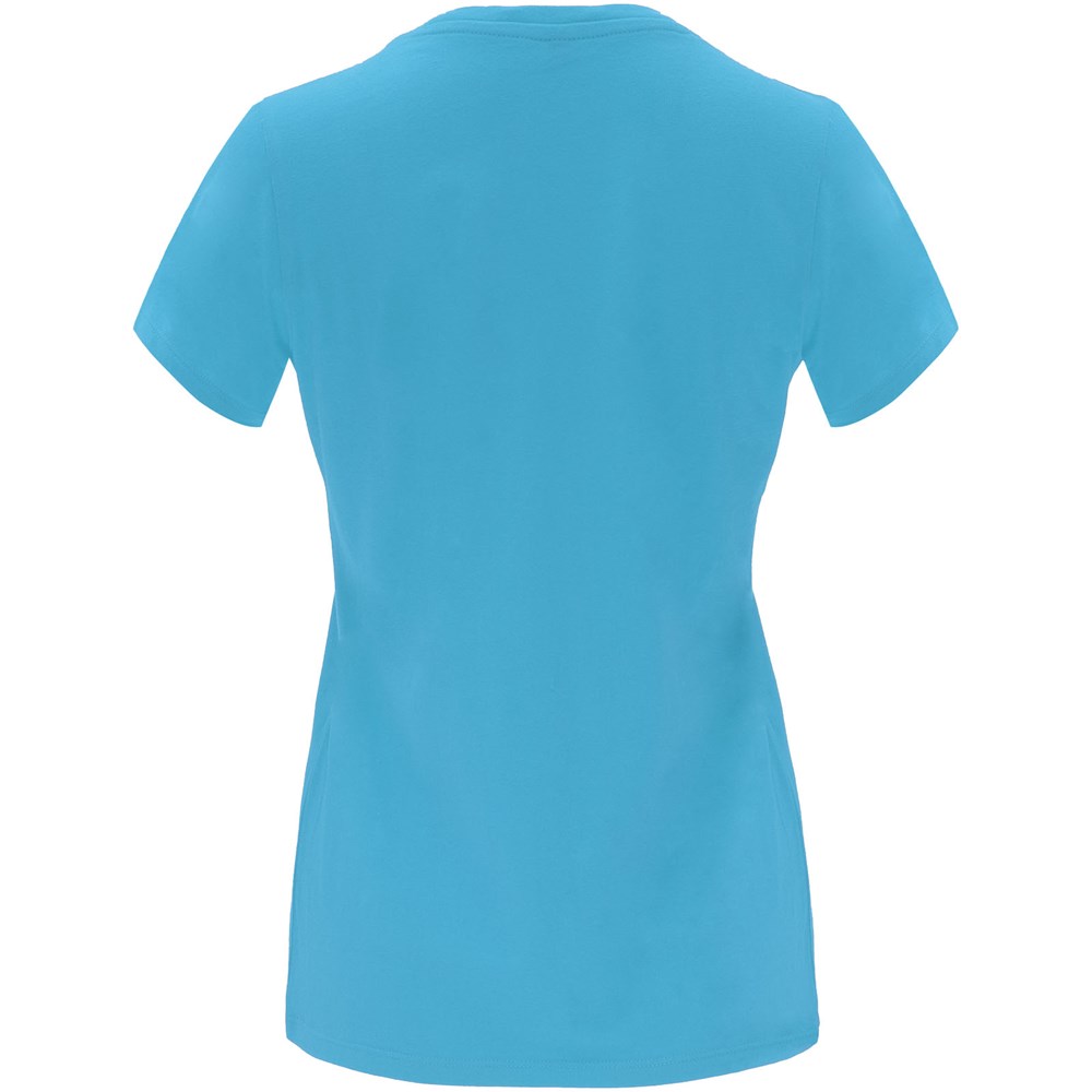 Tailliertes kurzärmeliges T-Shirt für Damen. Rundhalsausschnitt mit 1×1 Rippstrick. Verstärkte und verdeckte Nähte am Kragen. Herausnehmbares Etikett.