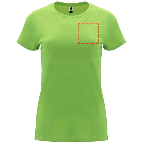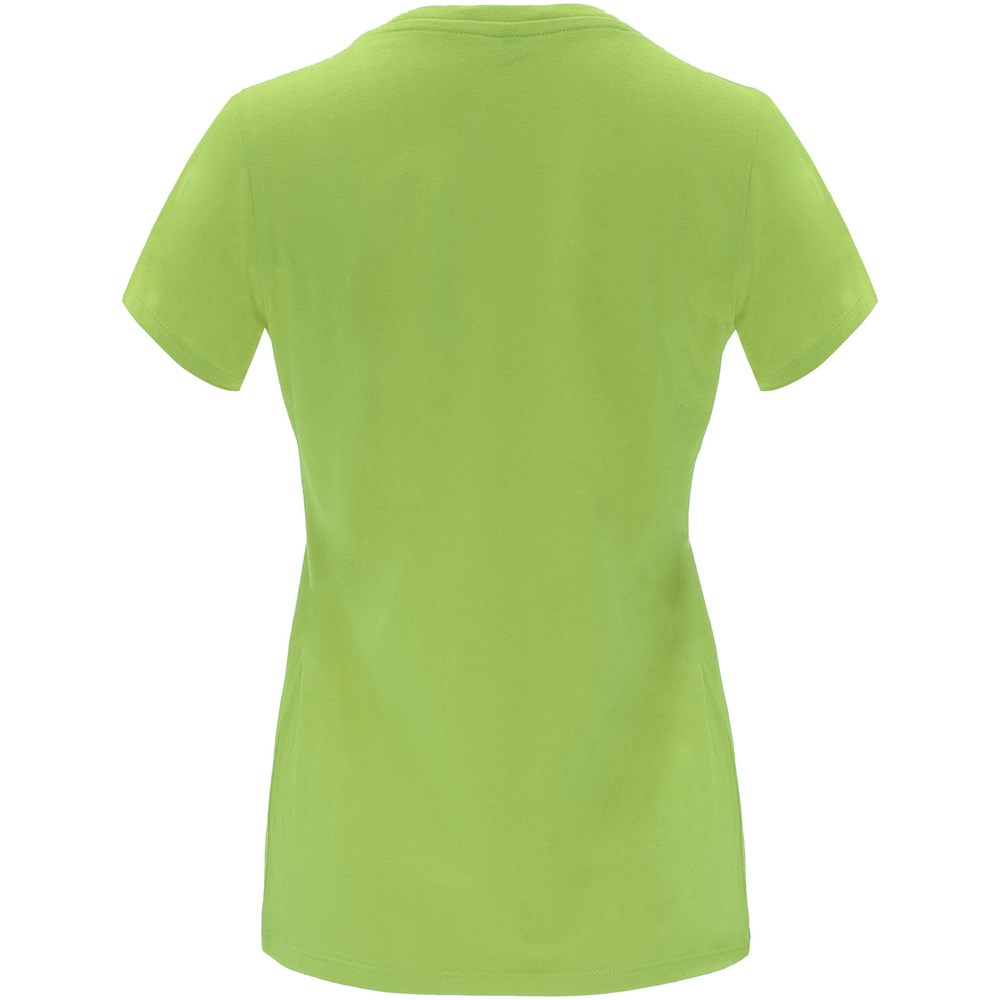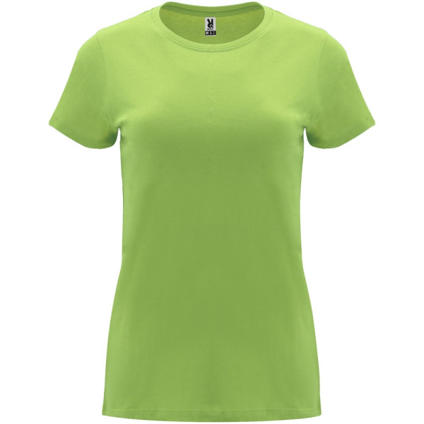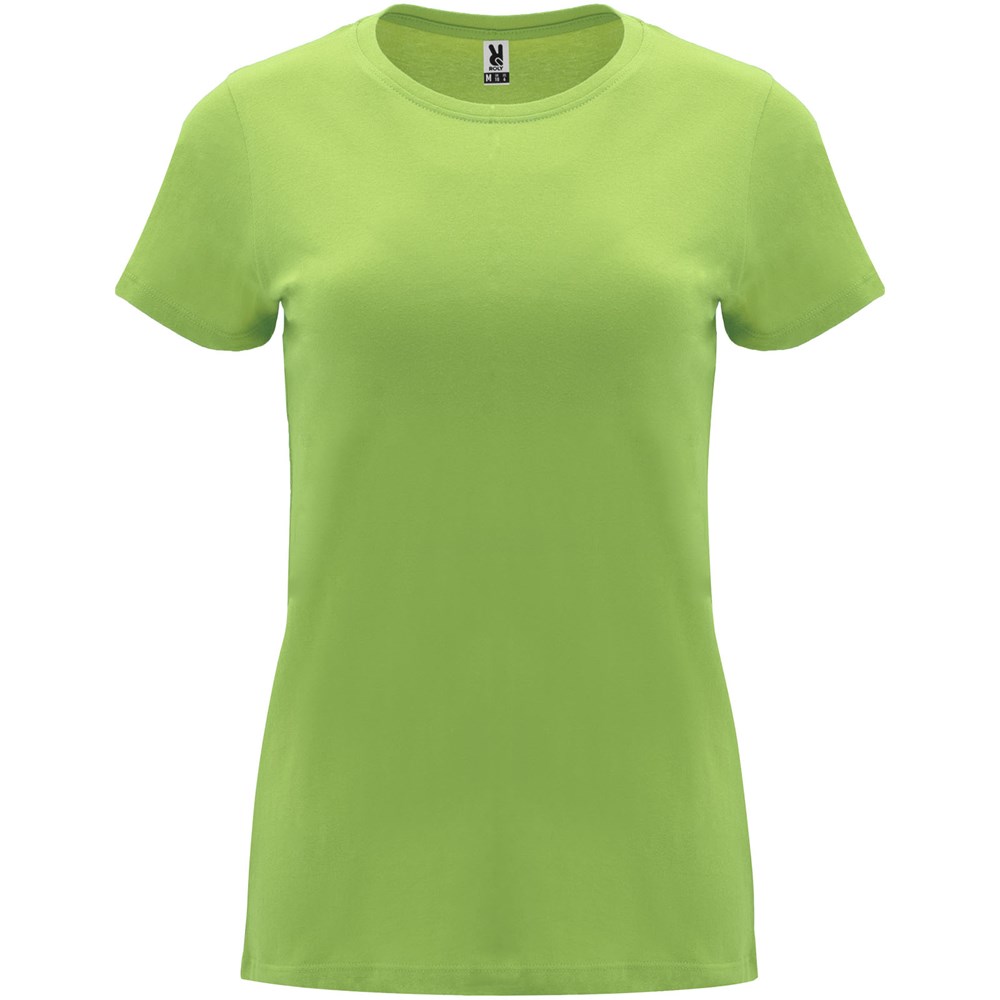 Tailliertes kurzärmeliges T-Shirt für Damen. Rundhalsausschnitt mit 1×1 Rippstrick. Verstärkte und verdeckte Nähte am Kragen. Herausnehmbares Etikett.