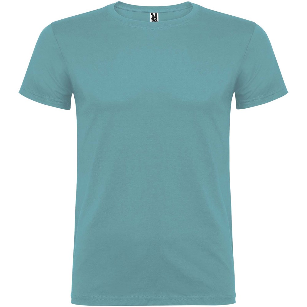 Kurzärmeliges T-Shirt mit doppellagigem Rundhalsausschnitt aus Elasthan, hergestellt aus schlauchförmigem Material für Erwachsene. Verstärkte und verdeckte Nähte am Kragen. Herausnehmbares Etikett. Das Modell ist 190 cm groß und trägt Größe L.