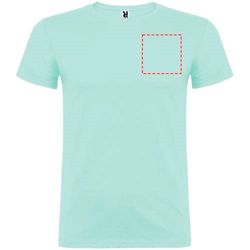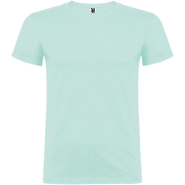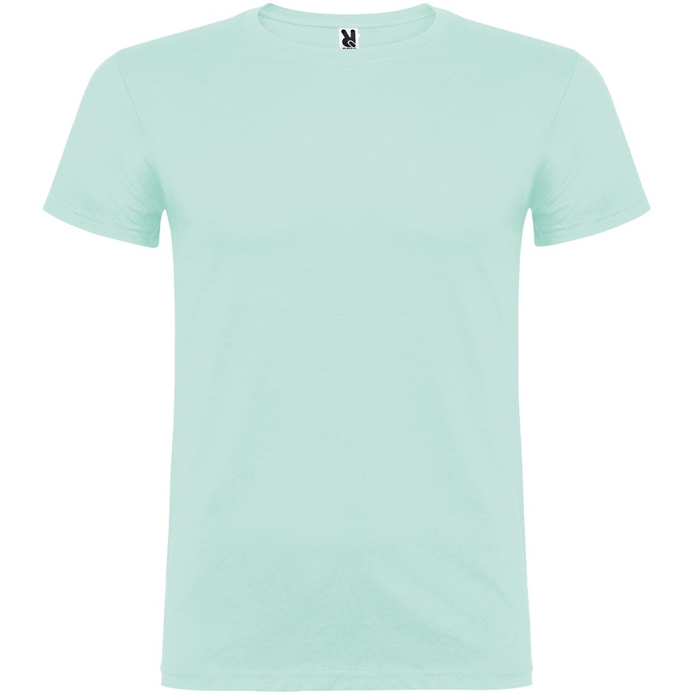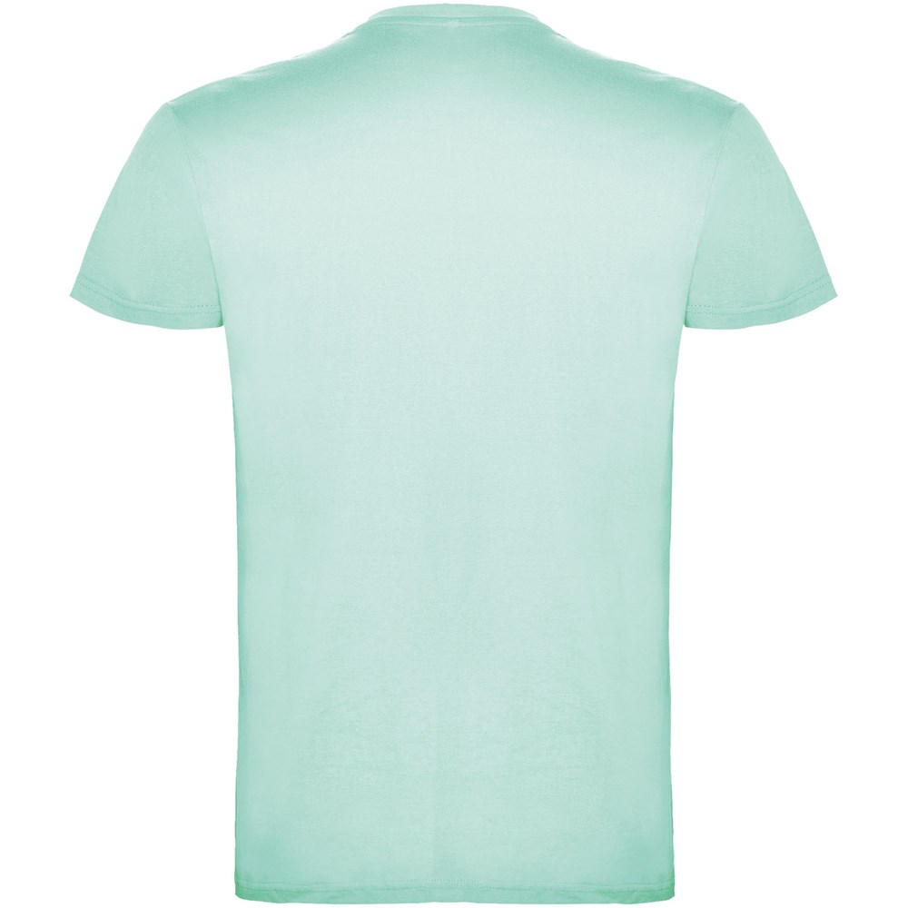 Kurzärmeliges T-Shirt mit doppellagigem Rundhalsausschnitt aus Elasthan, hergestellt aus schlauchförmigem Material für Erwachsene. Verstärkte und verdeckte Nähte am Kragen. Herausnehmbares Etikett. Das Modell ist 190 cm groß und trägt Größe L.