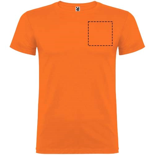 Kurzärmeliges T-Shirt mit doppellagigem Rundhalsausschnitt aus Elasthan, hergestellt aus schlauchförmigem Material für Erwachsene. Verstärkte und verdeckte Nähte am Kragen. Herausnehmbares Etikett. Das Modell ist 190 cm groß und trägt Größe L.