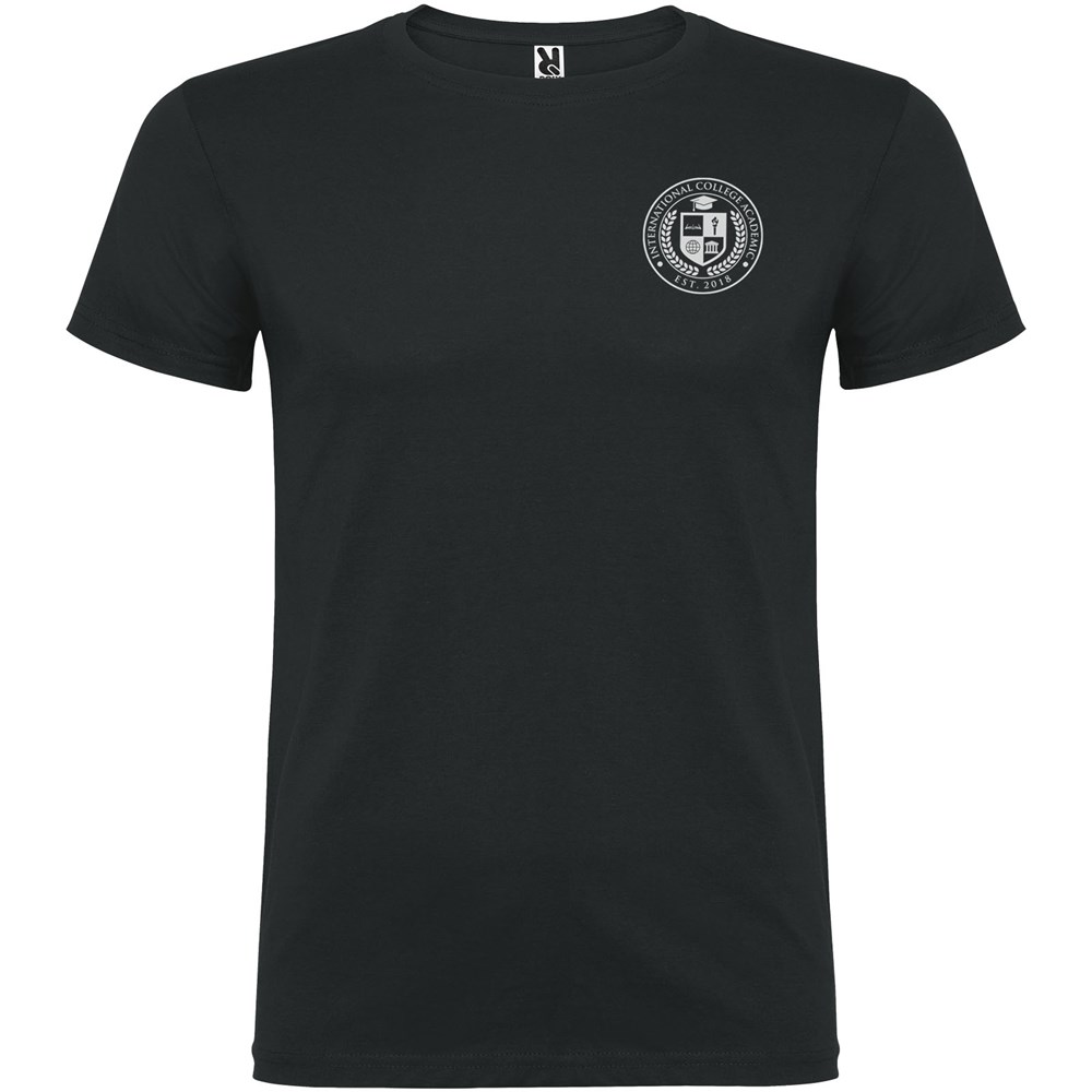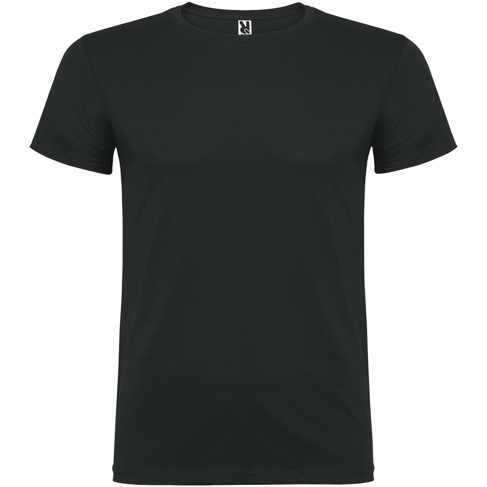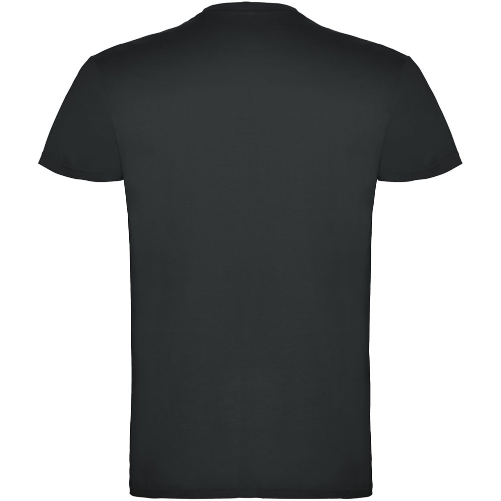 Kurzärmeliges T-Shirt mit doppellagigem Rundhalsausschnitt aus Elasthan, hergestellt aus schlauchförmigem Material für Erwachsene. Verstärkte und verdeckte Nähte am Kragen. Herausnehmbares Etikett. Das Modell ist 190 cm groß und trägt Größe L.