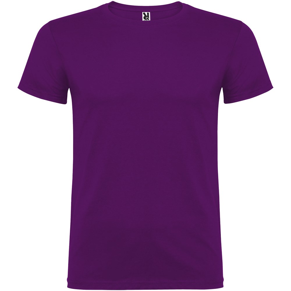 Kurzärmeliges T-Shirt mit doppellagigem Rundhalsausschnitt aus Elasthan, hergestellt aus schlauchförmigem Material für Erwachsene. Verstärkte und verdeckte Nähte am Kragen. Herausnehmbares Etikett. Das Modell ist 190 cm groß und trägt Größe L.