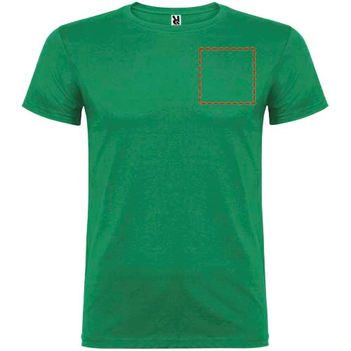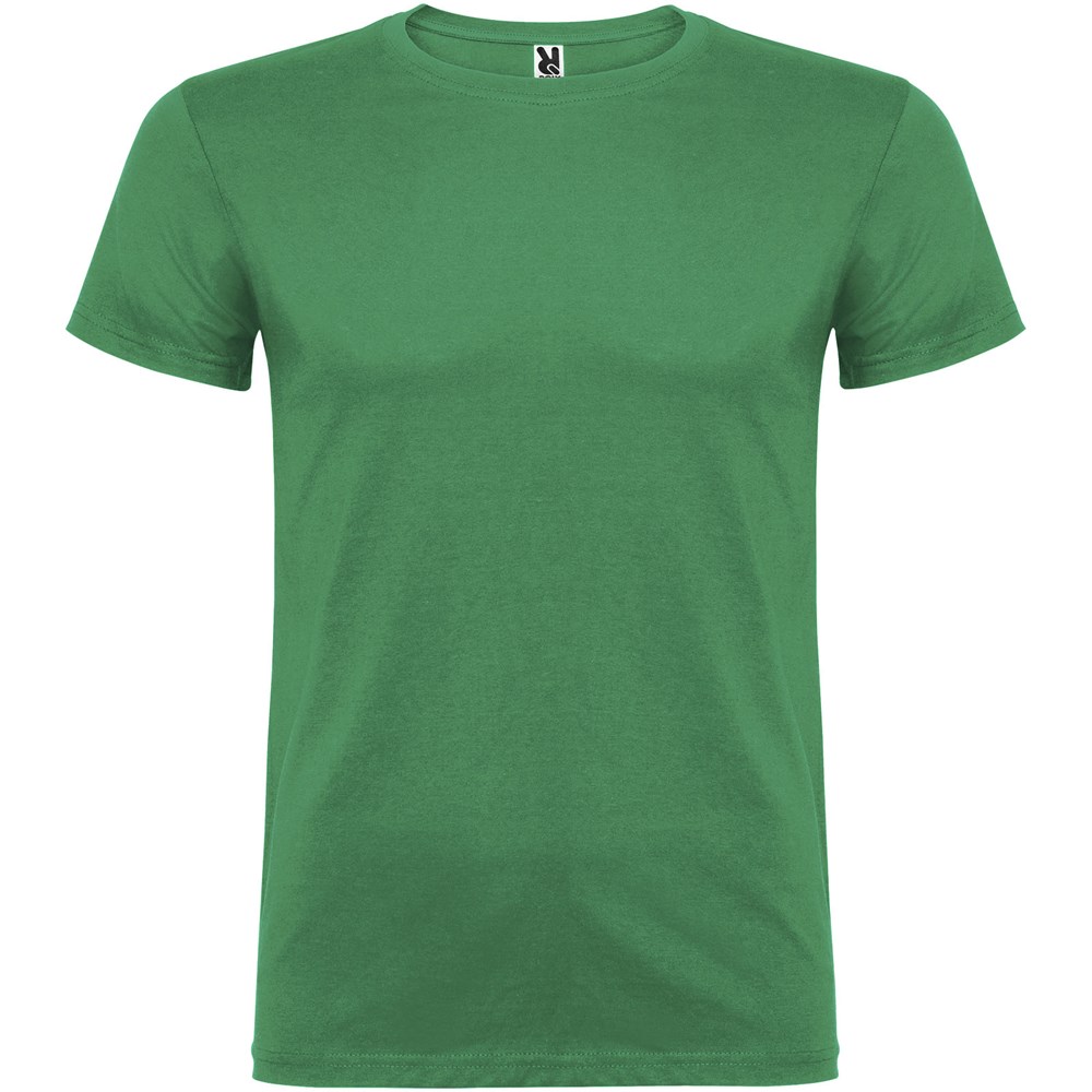 Kurzärmeliges T-Shirt mit doppellagigem Rundhalsausschnitt aus Elasthan, hergestellt aus schlauchförmigem Material für Erwachsene. Verstärkte und verdeckte Nähte am Kragen. Herausnehmbares Etikett. Das Modell ist 190 cm groß und trägt Größe L.