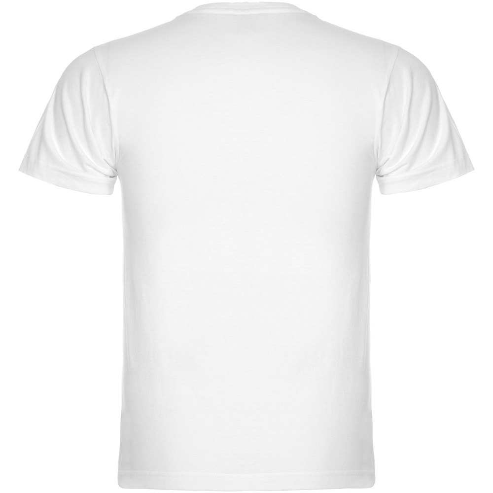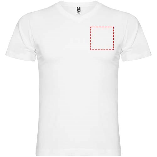 Schlauchförmiges kurzärmeliges T-Shirt mit 2-lagigem V-Ausschnitt. Verstärkte und verdeckte Nähte an Kragen und Schultern. Herausnehmbares Etikett. Das Modell ist 190 cm groß und trägt Größe L.
