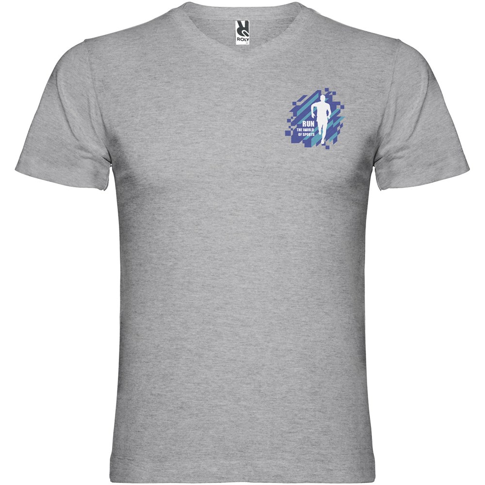Schlauchförmiges kurzärmeliges T-Shirt mit 2-lagigem V-Ausschnitt. Verstärkte und verdeckte Nähte an Kragen und Schultern. Herausnehmbares Etikett. Das Modell ist 190 cm groß und trägt Größe L.