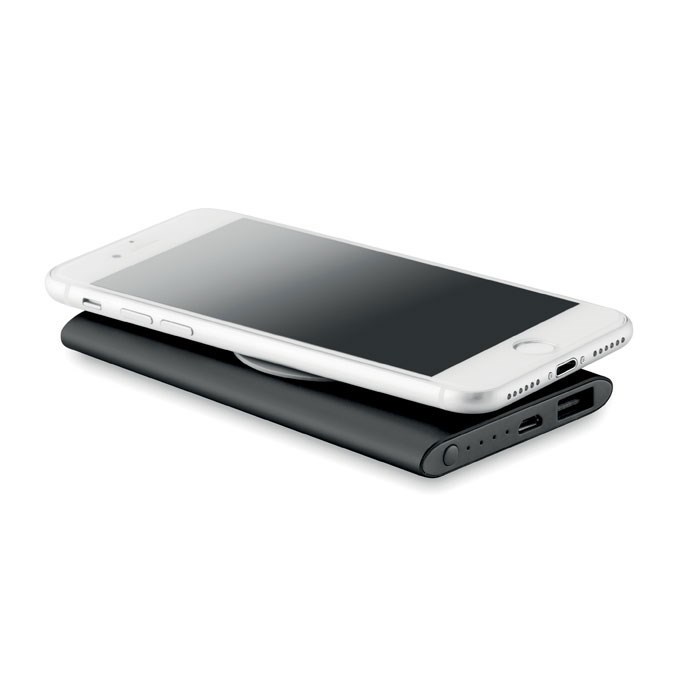 Induktive Ladestation mit 4000 mAh Powerbank aus recyceltem Aluminium. Inkl. Typ C Adapter. Ausgangsleistung: DC5V/1.0A.